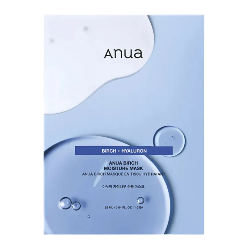 Anua Birch Moisture Mask Moisturizing Sheet Mask – drėkinanti lakštinė kaukė, padedanti išlaikyti odos gyvybingumą, elastingumą ir skaistumą. Beržų sultys, gausios vitaminų, amino rūgščių ir antioksidantų, kartu su Aquaxyl™ kompleksu intensyviai drėkina ir apsaugo odą nuo dehidratacijos. Beta gliukanas stiprina odos barjerą ir mažina paraudimus, o keramidai bei taukmedžio sviestas saugo nuo sausumo ir šerpetojimų. Hialurono rūgštis palaiko odos lygumą, elastingumą ir padeda sulaikyti drėgmę.