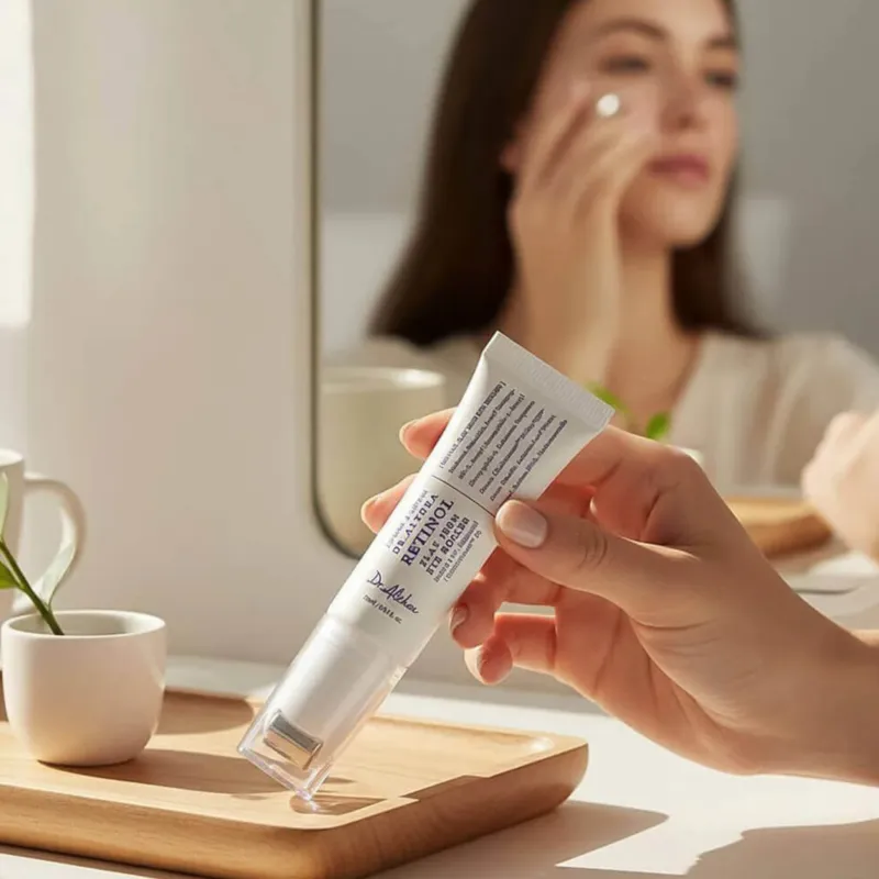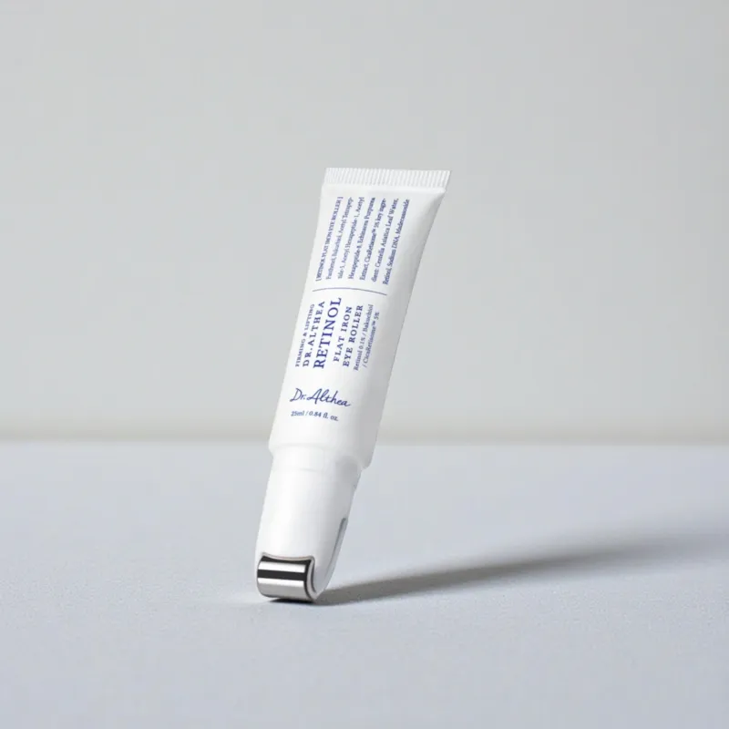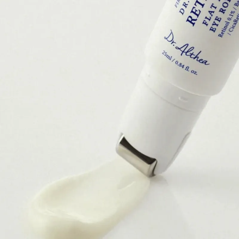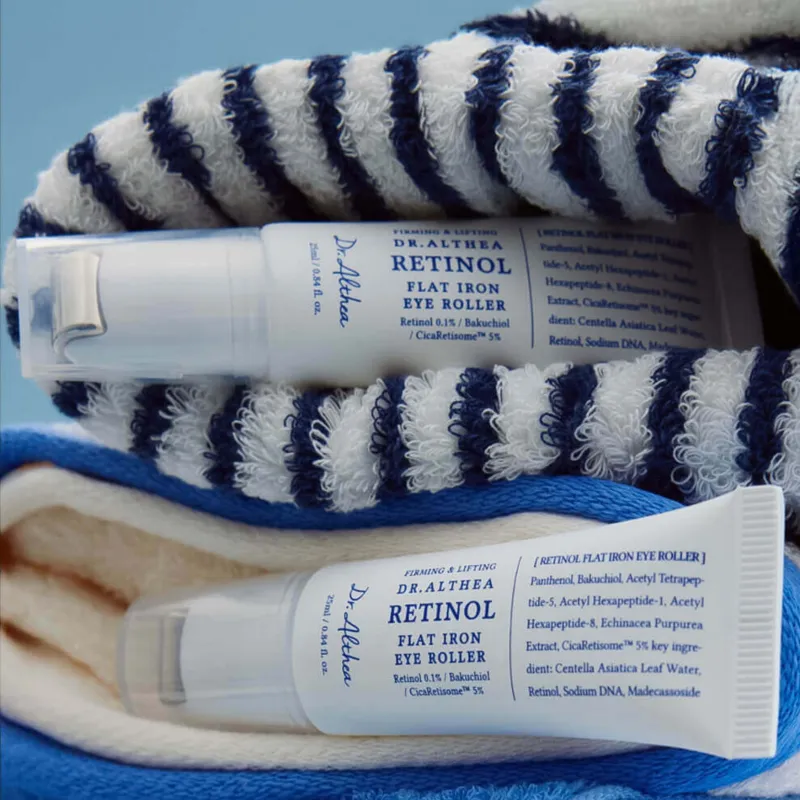 Dr. Althea Retinol Flat Iron Eye Roller Serum - tai pažangus paakių serumas su metaliniu masažuojančiu aplikatoriumi, skirtas mažinti raukšlių, paburkimo ir nuovargio požymius. Retinolio ir bakučiolio derinys padeda skatinti odos atsinaujinimą ir gerinti elastingumą, išlaikant komfortą jautriai paakių zonai. Vėsinantis aplikatorius suteikia gaivumo pojūtį ir padeda sumažinti paburkimą. Oda aplink akis atrodo lygesnė, stangresnė ir skaistesnė.