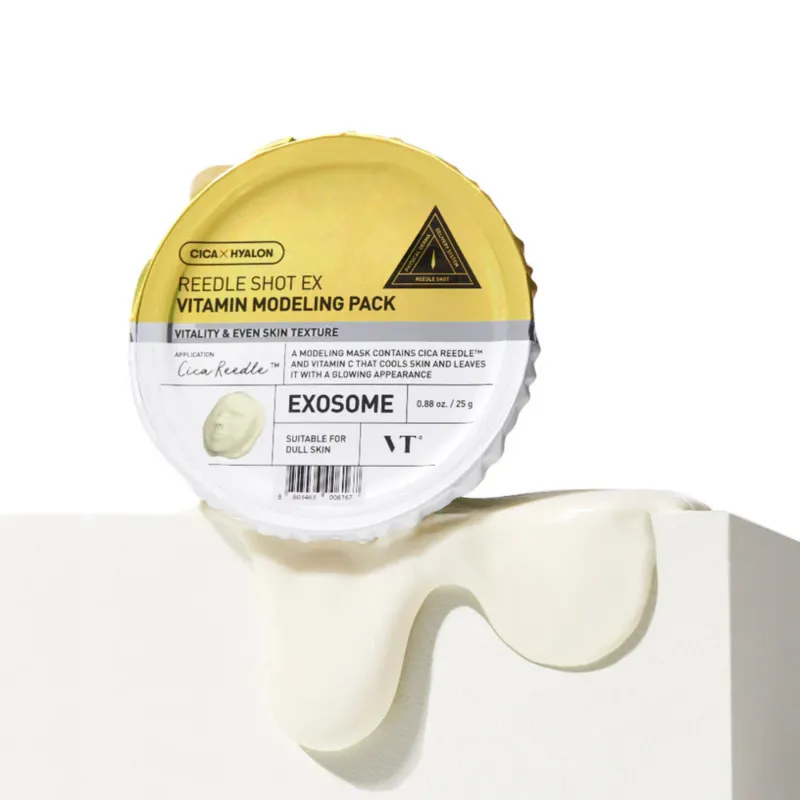 VT Cosmetics Reedle Shot EX Vitamin Modeling Pack – tai modeliuojanti (alginate) veido kaukė, skirta skaistesnės, gyvybingesnės ir lygesnės odos išvaizdos palaikymui. Sumaišius su vandeniu, kaukė virsta elastinga mase, kuri priglunda prie odos ir padeda išlaikyti drėgmę bei sustiprinti veikliųjų medžiagų poveikio pojūtį. Formulė orientuota į papilkėjusią, pavargusią ar skaistumą praradusią odą, suteikiant jai gaivesnės ir labiau švytinčios odos įspūdį. Reedle Shot EX technologija padeda veikliosioms medžiagoms geriau įsisavinti, o egzosomos ir modeliuojančios kaukės efektas sustiprina odos priežiūros pojūtį. Kartu su kolageno kompleksu ši sistema padeda palaikyti elastingesnės, lygesnės ir putlesnės odos įspūdį.
